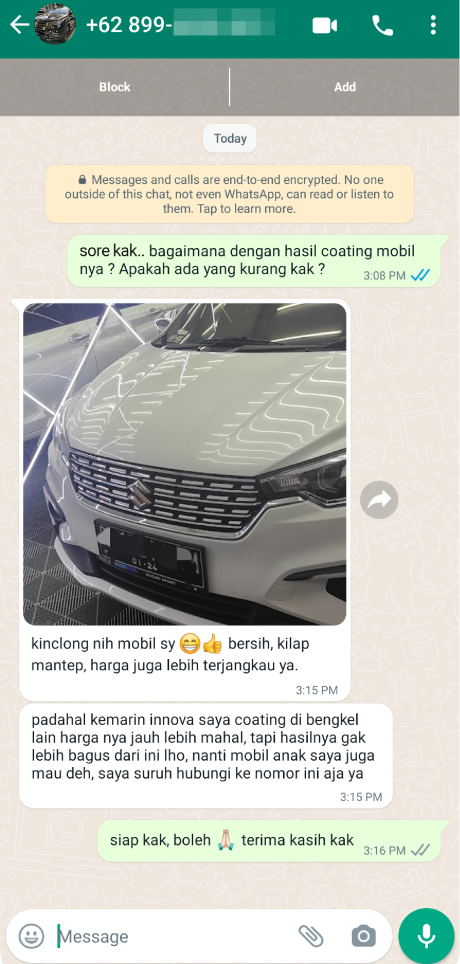Coating bahan super ceramic 9H+ (SiO2, kadar 99%) kualitas terbaik karena bening tipis tetapi keras, 3x lebih kuat daripada bahan ceramic biasa lainnya, efek kilap dengan jangka waktu lebih lama.